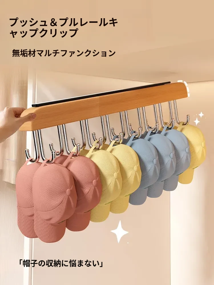 帽子収納の神アイテム!穴あけ不要で便利な衣類フック、クローゼット内に最適な多機能ハンガー。帽子や衣類をスマートに整理し、スペースを有効活用!