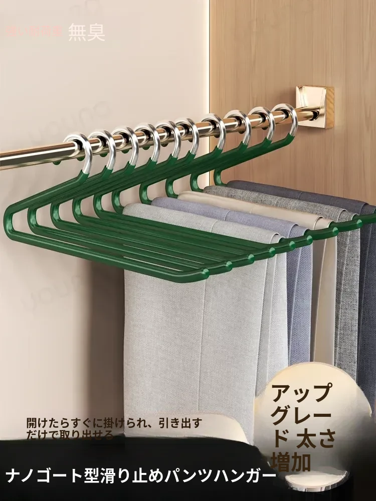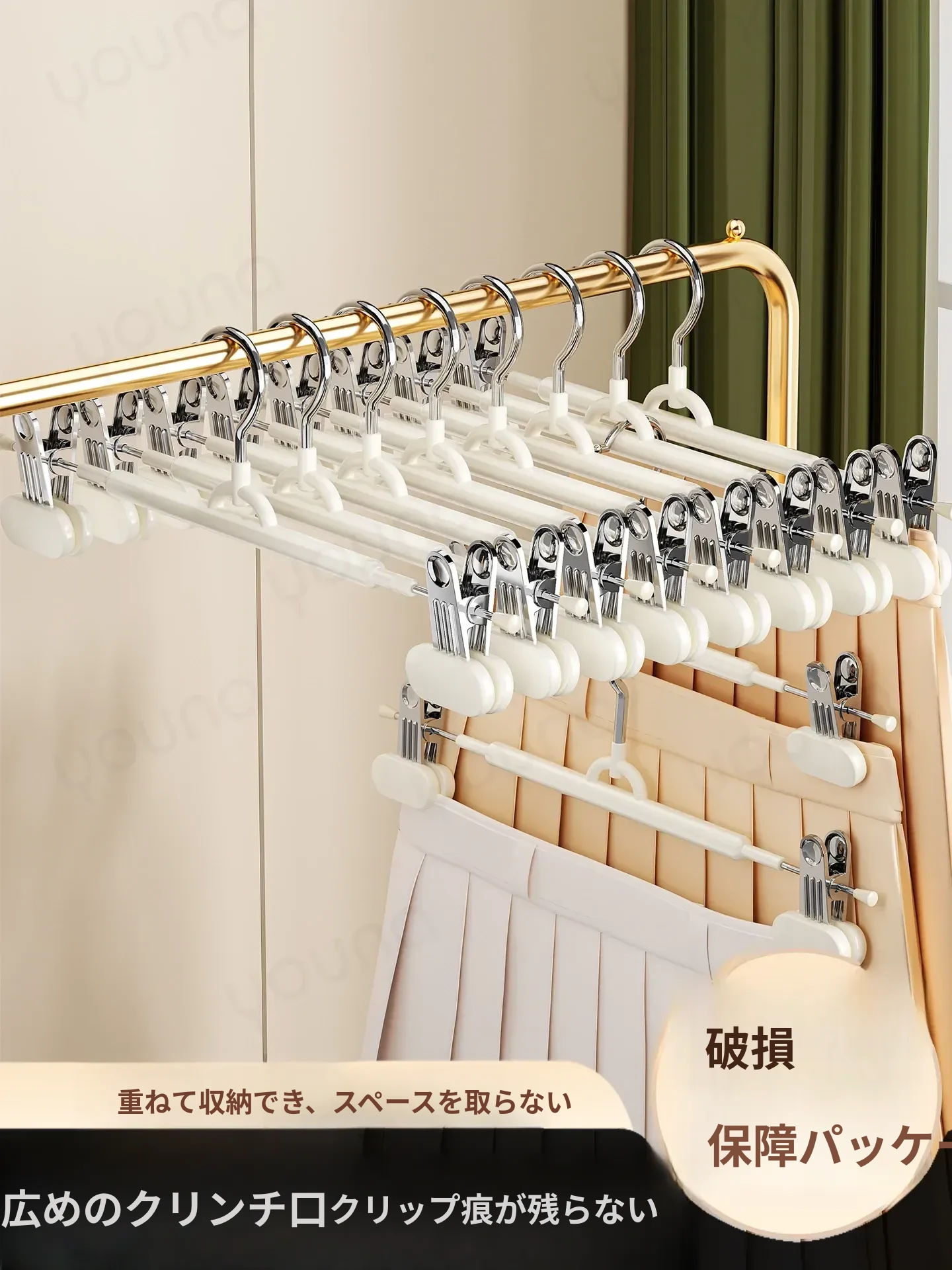 滑り止め付き!家庭用無痕パンツハンガー、クリップ付きでスカートやパンツに最適。ステンレス製で耐久性抜群、洗濯時も安心して使用できます。収納が簡単で、あなたのクローゼットをスッキリ整理!
