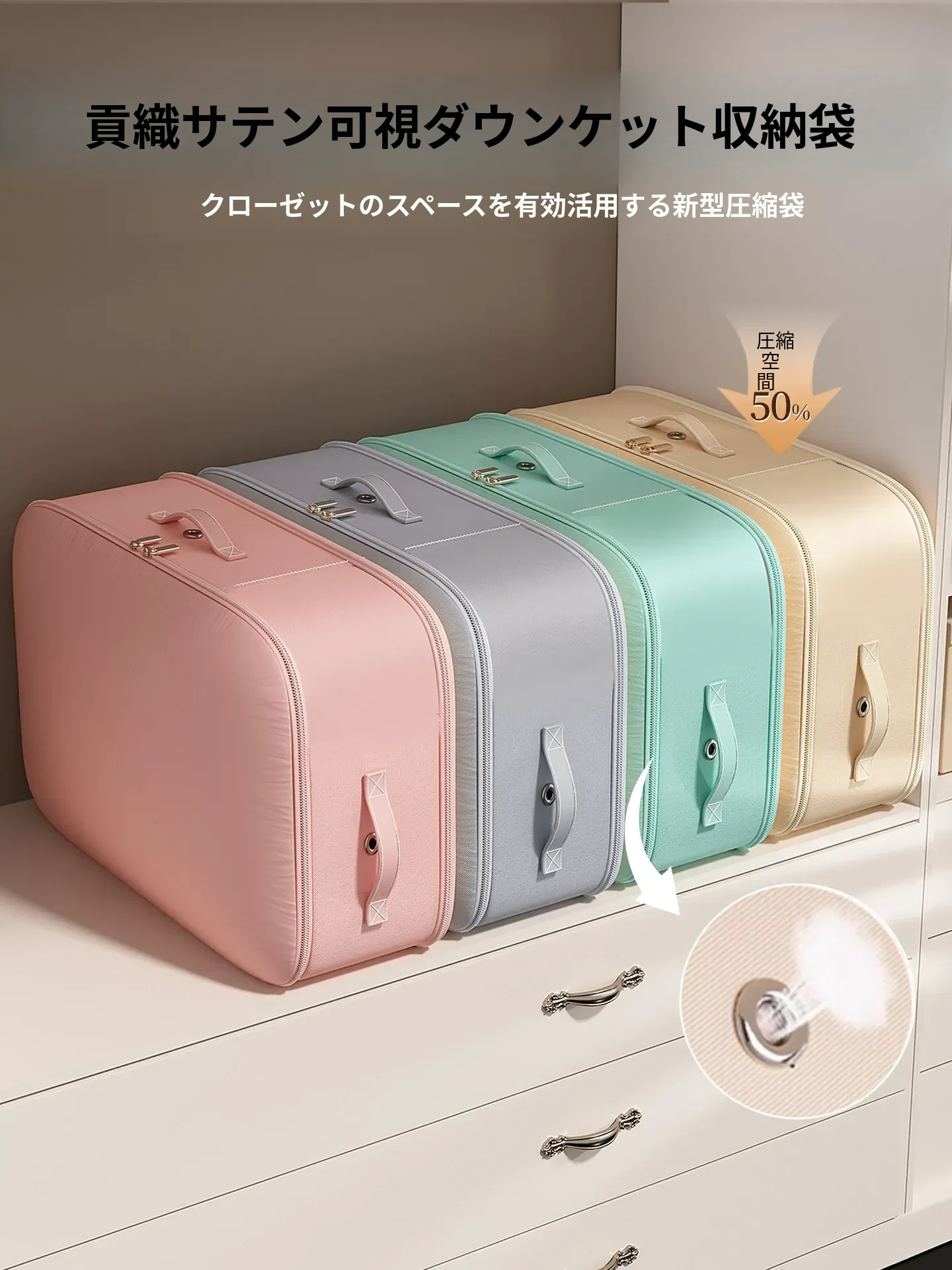 便利な圧縮収納袋!シルクのような肌触りのダウンジャケットや布団、衣類をコンパクトに整理。旅行や引っ越しに最適なポータブル収納バッグ。お部屋をスッキリさせる必需品!